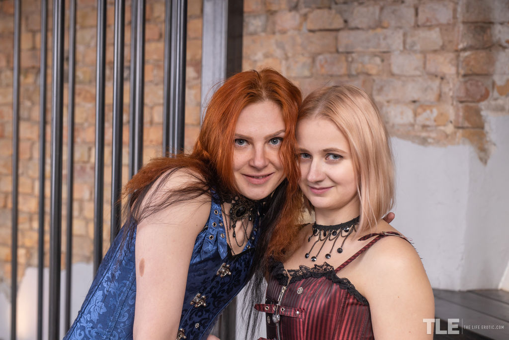 Hot lesbian lovers Leane and Selena A cavort in tight-laced satin corsets, blonde Leane watches as her red-haired girlfriend performs a fire-eating trick as they trade lustful looks, they blow out the fireballs, then melt into a passionate kiss.. 16 photos